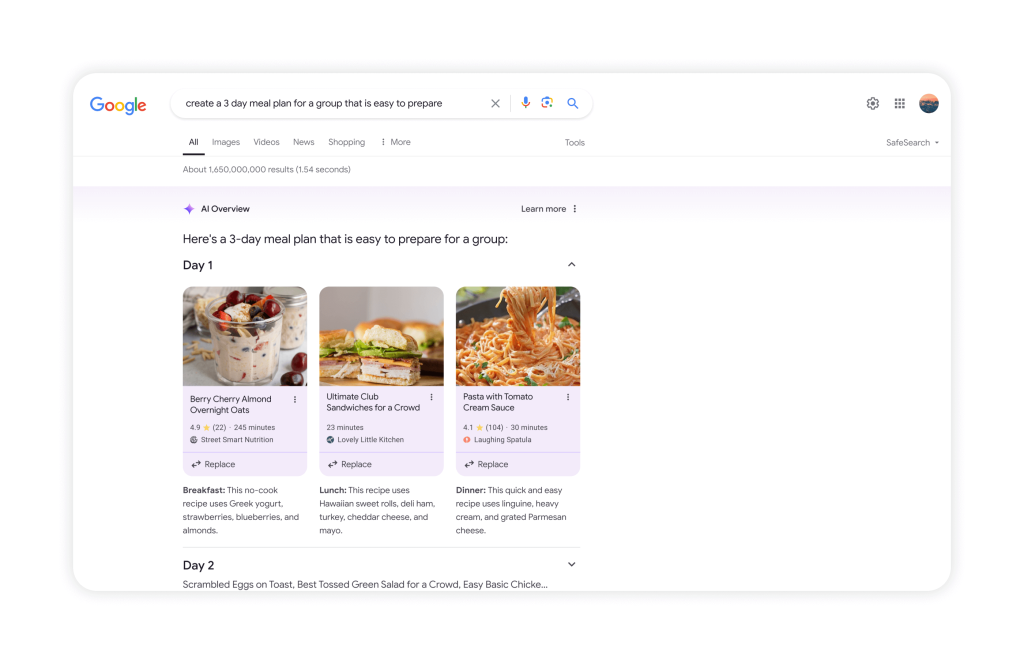In addition to answering complex queries, Google will offer planning assistance for various aspects of life, such as meal planning and vacations. Users can request a customized meal plan by searching for something like “create a 3-day meal plan for a group that’s easy to prepare,” and receive a tailored plan with recipes from across the web.